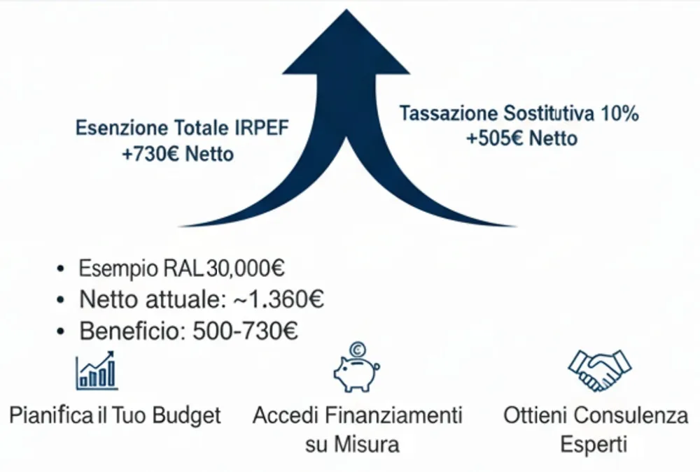 Situazione attuale: Tra IRPEF al 35% (per questa fascia di reddito) e contributi al 9,19%, il netto percepito si aggira intorno ai1.360 euro .Con Esenzione Totale IRPEF: Il netto salirebbe a circa2.096 euro , con un beneficio di circa 736 euro.Con Tassazione al 10%: Il netto arriverebbe a circa1.865 euro , con un beneficio di circa 505 euro.